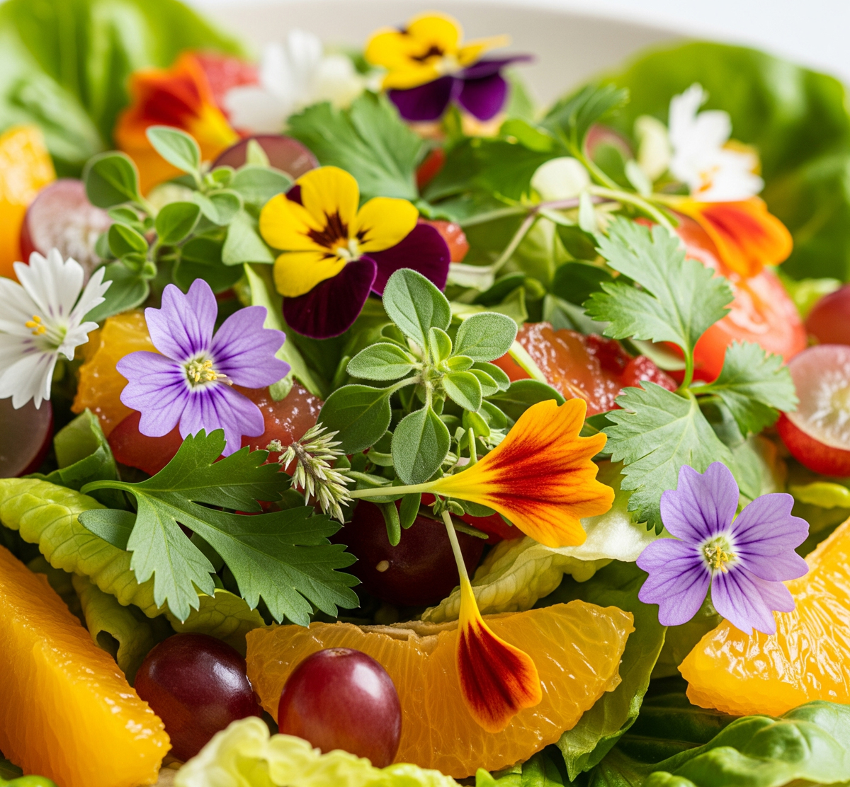 Pansy – (Viola x wittrockiana, Viola tricolor) – Add in salads for a beautiful color, or for cake decoration. Mild minty taste.