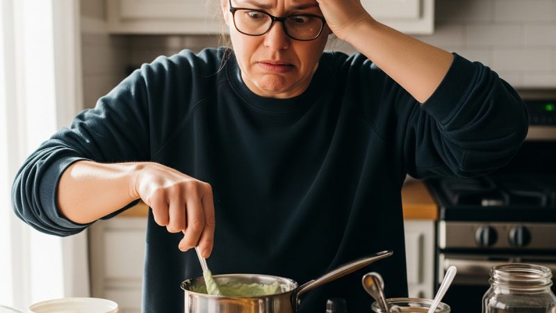 6. Slowly pour the lye into the milk. Take twenty minutes to do this, stirring all the while. Monitor the milk temperature and keep it below 150 degrees so it does not burn. When all the lye is added, let the mixture cool until it is 110 degrees.