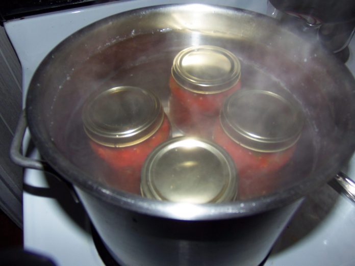 After you have collected your equipment and prepared your food ingredients, you’re ready to begin the canning process. Take your freshly sterilized jar, making sure it is still warm and fill them with the prepared food. Be sure to leave a little head room in each jar according to the recommendation in your recipe, a general rule of thumb is about one inch. Wipe the top of each jar with a clean towel to remove any debris that might keep the jar from making a secure seal. Place the lid on the jar centering it so the rubber is on the entire rim. Screw on band, but do not tighten it so the gasses can escape from the jar.